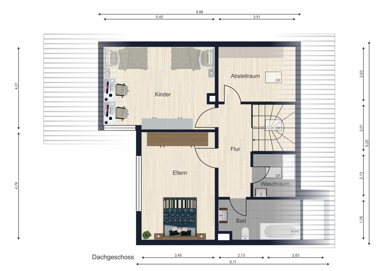 Im Obergeschoss befinden sich die privaten Rückzugsbereiche: mehrere Schlafzimmer sowie ein Tageslichtbad mit Badewanne. Zusätzliche Wohn- und Nutzfläche bietet das Untergeschoss – inklusive einem wohnlich ausgebauten Party- oder Hobbyraum, der flexibel genutzt werden kann.