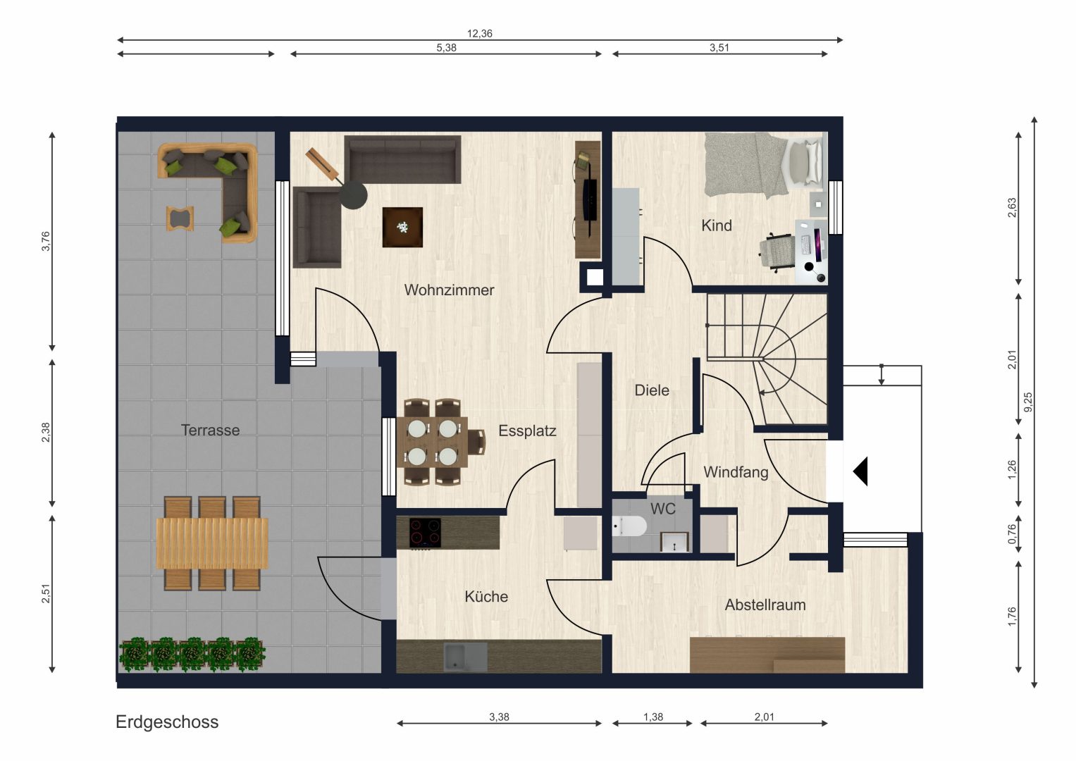 Im Erdgeschoss empfängt Sie ein großzügiger Wohn- und Essbereich mit direktem Zugang zur Terrasse und dem liebevoll angelegten Garten. Hier genießen Sie sonnige Nachmittage, Zeit mit der Familie oder entspannte Stunden im Grünen. Die separate Küche ist funktional gestaltet und bietet ausreichend Platz für den Alltag.