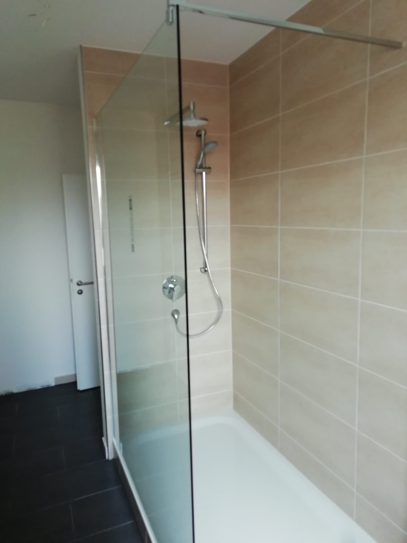 Alle Bäder sind zeitgemäß ausgestattet. In mehreren Wohnungen befinden sich bodengleiche Walk-in-Duschen sowie hochwertige Sanitärobjekte. Die Bilder vermitteln einen Eindruck der gepflegten Ausstattung und Raumwirkung.