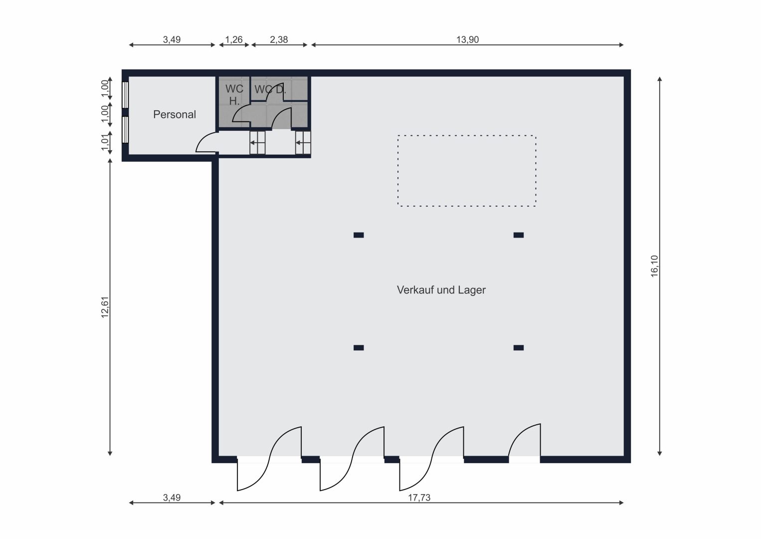 Die Fläche liegt im Erdgeschoss eines gepflegten Gebäudes mit repräsentativer Straßenfront und hoher Sichtbarkeit. Große Fensterflächen sorgen für eine helle, einladende Atmosphäre und bieten ausgezeichnete Möglichkeiten für Werbung und Präsentation.